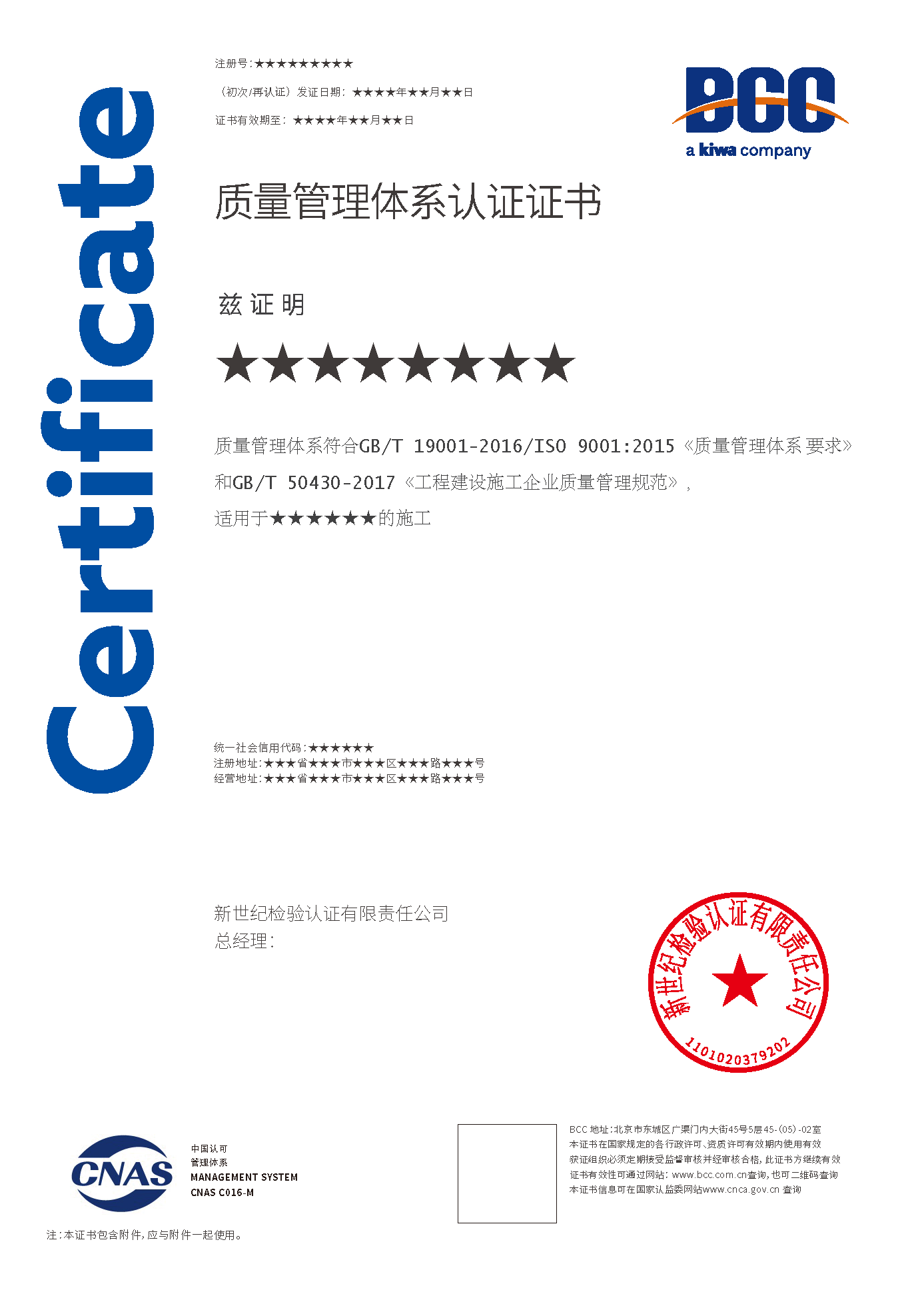 工程建設(shè)施工企業(yè)質(zhì)量管理體系認(rèn)證適用于建設(shè)施工單位(住建部頒發(fā)資質(zhì)的施工企業(yè)),既可以用于施工總承包的單位,如:建筑工程、市政公用工程、電力工程、公路工程、鐵路工程、機(jī)電工程等;此外,還可用于專業(yè)承包的單位,如:防水防腐保溫工程、建筑裝修裝飾工程、消防設(shè)施工程、建筑幕墻工程、電子與智能化工程、建筑機(jī)電安裝工程、環(huán)保工程、鋼結(jié)構(gòu)工程等。