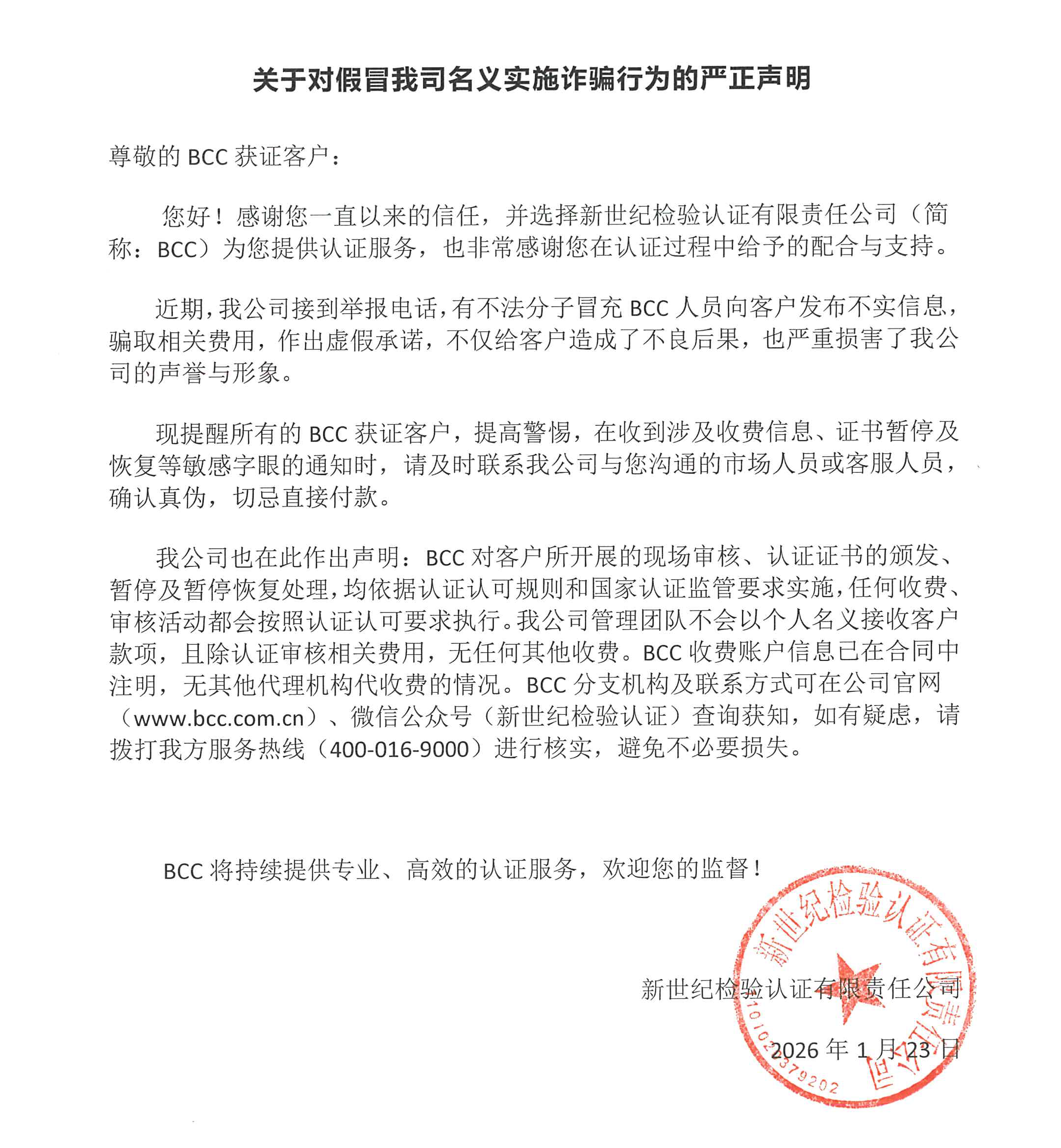 我公司也在此作出聲明:BCC對客戶所開展的現(xiàn)場審核、認(rèn)證證書的頒發(fā)、暫停及暫停恢復(fù)處理,均依據(jù)認(rèn)證認(rèn)可規(guī)則和國家認(rèn)證監(jiān)管要求實(shí)施,任何收費(fèi)、審核活動都會按照認(rèn)證認(rèn)可要求執(zhí)行。我公司管理團(tuán)隊(duì)不會以個人名義接收客戶款項(xiàng),且除認(rèn)證審核相關(guān)費(fèi)用,無任何其他收費(fèi)。BCC收費(fèi)賬戶信息已在合同中注明,無其他代理機(jī)構(gòu)代收費(fèi)的情況。BCC分支機(jī)構(gòu)及聯(lián)系方式可在公司官網(wǎng)(www.815361.com)、微信公眾號(新世紀(jì)檢驗(yàn)認(rèn)證)查詢獲知,如有疑慮,請撥打我方服務(wù)熱線(400-016-9000)進(jìn)行核實(shí),避免不必要損失。