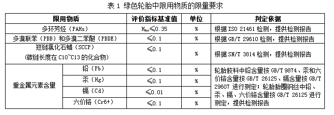 3、環(huán)境屬性。參照已發(fā)布并實施的《輪胎中限用物質(zhì)的限量要求》國家標準,對輪胎胎面、胎側、胎圈(除鋼絲以外部分)、三角膠、內(nèi)襯層、內(nèi)胎、墊帶、胎圈鋼絲等各部位的多環(huán)芳烴(PAHs)、重金屬(鉛、汞、鎘、六價鉻)、短鏈氯化石蠟(SCCP)、多溴聯(lián)苯(PBB)和多溴二苯醚(PBDE)等限用物質(zhì)提出了要求,具體評價指標基準值及判定依據(jù)詳見表1。